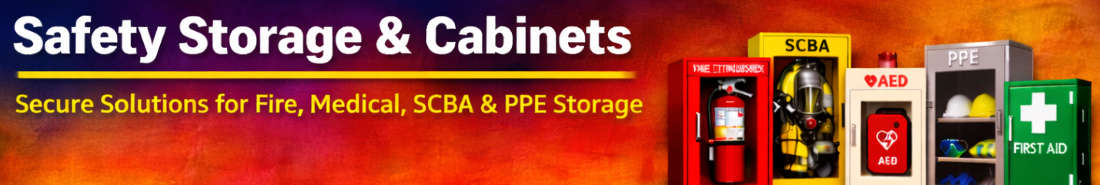 Safety storage cabinets designed to protect, organize, and provide quick access to critical safety equipment. From fire extinguisher cabinets and SCBA storage to AED and PPE cabinets, these solutions help maintain compliance, improve visibility, and ensure readiness in emergency situations.