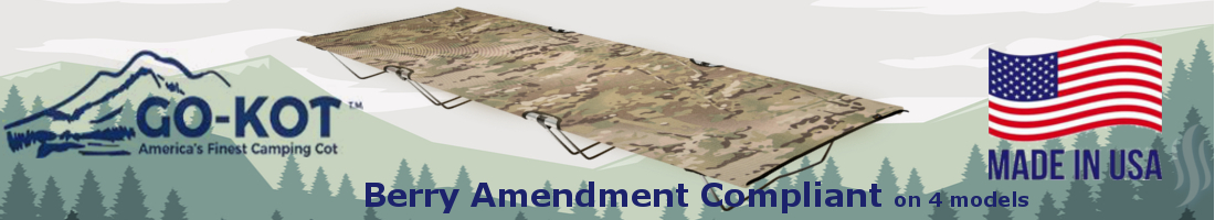 GO-KOTĀ® Camping Cot is manufactured in USA & is the highest quality camping cot made. GO-KOT camping cot is extremely portable, durable and comfortable and the only low-profile camping cot that is also offered as Berry Amendment Compliant.